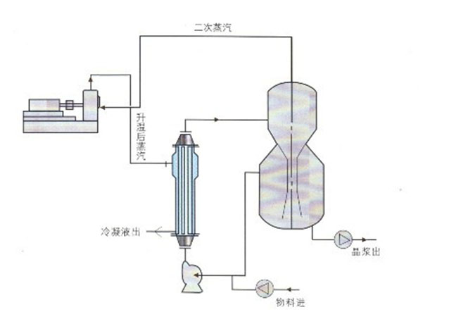 從蒸發(fā)器出來(lái)的二次蒸汽,經(jīng)壓縮機(jī)壓縮,壓力、溫度升高,熱焓增加,然后送到蒸發(fā)器的加熱室當(dāng)做加熱蒸汽使用,使液料維持沸騰狀態(tài),而加熱蒸汽本身則冷凝成水。這樣,原先要廢棄的蒸汽就得到了有效的利用,回收了潛熱,提高了熱效率。為使蒸發(fā)裝置的制造盡可能簡(jiǎn)單和操作方便,經(jīng)常使用單效離心再壓縮器,也可以是高壓風(fēng)機(jī)或透平壓縮器。對(duì)于低的蒸發(fā)速率,也可用活塞式壓縮機(jī)、滑片壓縮機(jī)或螺旋壓縮機(jī)。