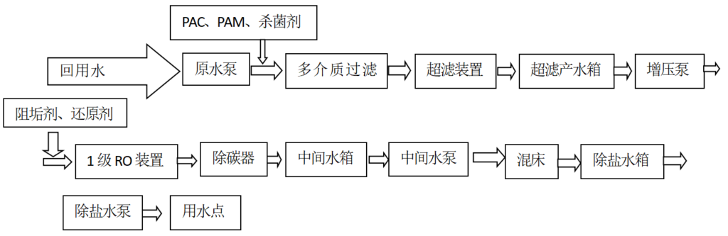 中水經(jīng)原水泵提升至多介質(zhì)過濾器,通過在其進水管道投加高效絮凝劑,采用微絮凝過濾方式,使水中部分懸浮物、有機物和膠體變成微絮體在無煙煤和石英砂濾層中截留而去除,再經(jīng)超濾進一步去除大分子有機物、膠體、細菌等,確保出水滿足反滲透的進水要求,即SDI≤3.0、濁度≤0.5NTU,超濾產(chǎn)水進超濾產(chǎn)水箱;超濾產(chǎn)水再經(jīng)增壓泵提升進入級反滲透裝置,去除95%以上的溶解固體(TDS)、硬度等,再經(jīng)除碳器去除反滲透產(chǎn)水中的二氧化碳;除碳器出水再經(jīng)增壓泵提升進入混合離子交換去除剩余的溶解鹽、硬度、SiO2等,確保系統(tǒng)產(chǎn)水滿足高壓鍋爐的給水要求。