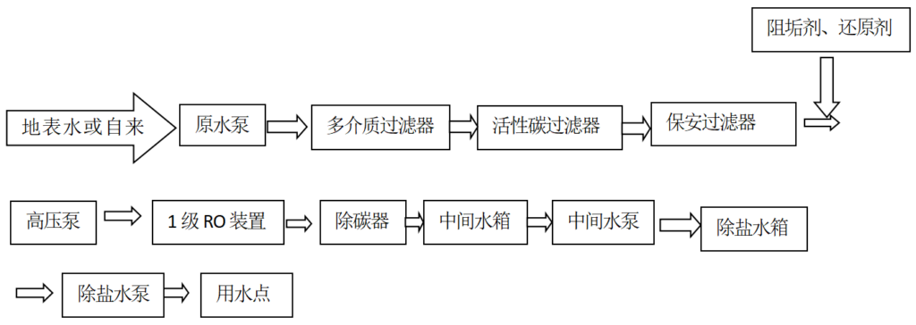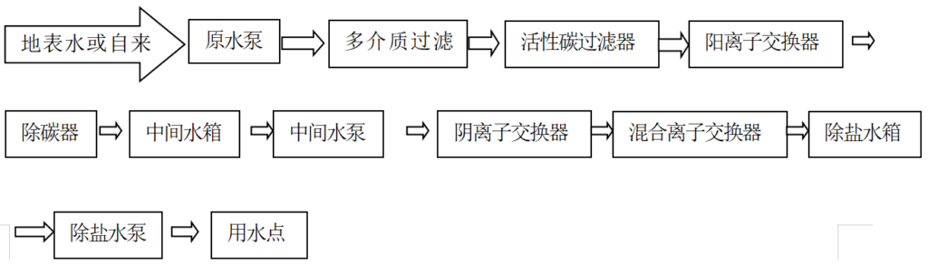 3.2、地表水或自來水為水源處理的全離子常規(guī)流程: